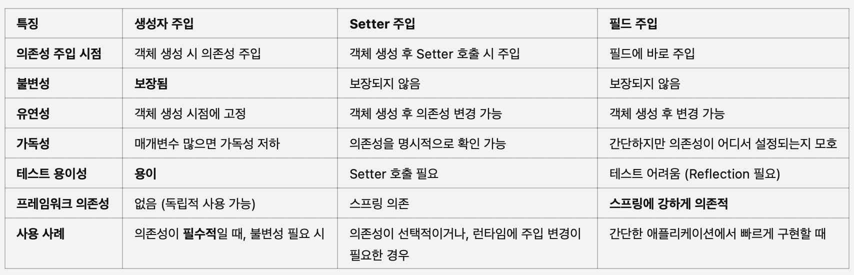 IOC(Inversion of Control)"제어의 역전" 즉, 객체나 메소드의 생명주기를 개발자가 관리하는 것이 아닌 외부(프레임워크)에서 결정하는 것이다. 개발자는 객체를 직접 생성하지 않고 필요한 객체를 프레임 워크에 요청하면 프레임워크가 알아서 생성하고 메모리에 올려서 관리한다. //IOC 없음public class OrderService { private PaymentService paymentService = new PaymentService(); // 직접 생성}//IOC 사용public class OrderService { @Autowired private PaymentService paymentService; // 스프링이 주입} DI(Dependency Inject..